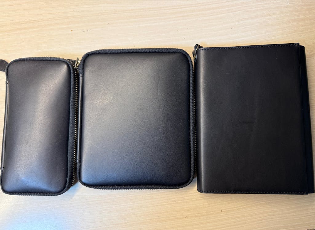 Leather is surprisingly lightweight (huge win!), pen holder is spacious, can fit even chunkier fountain pens. Side pockets and bookmarks are a thoughtful touch. Can fit my planner perfectly (Take A Note B6), can even fit another slim notebook inside. It’s slowly turning a more caramel color. Overall, loving it!